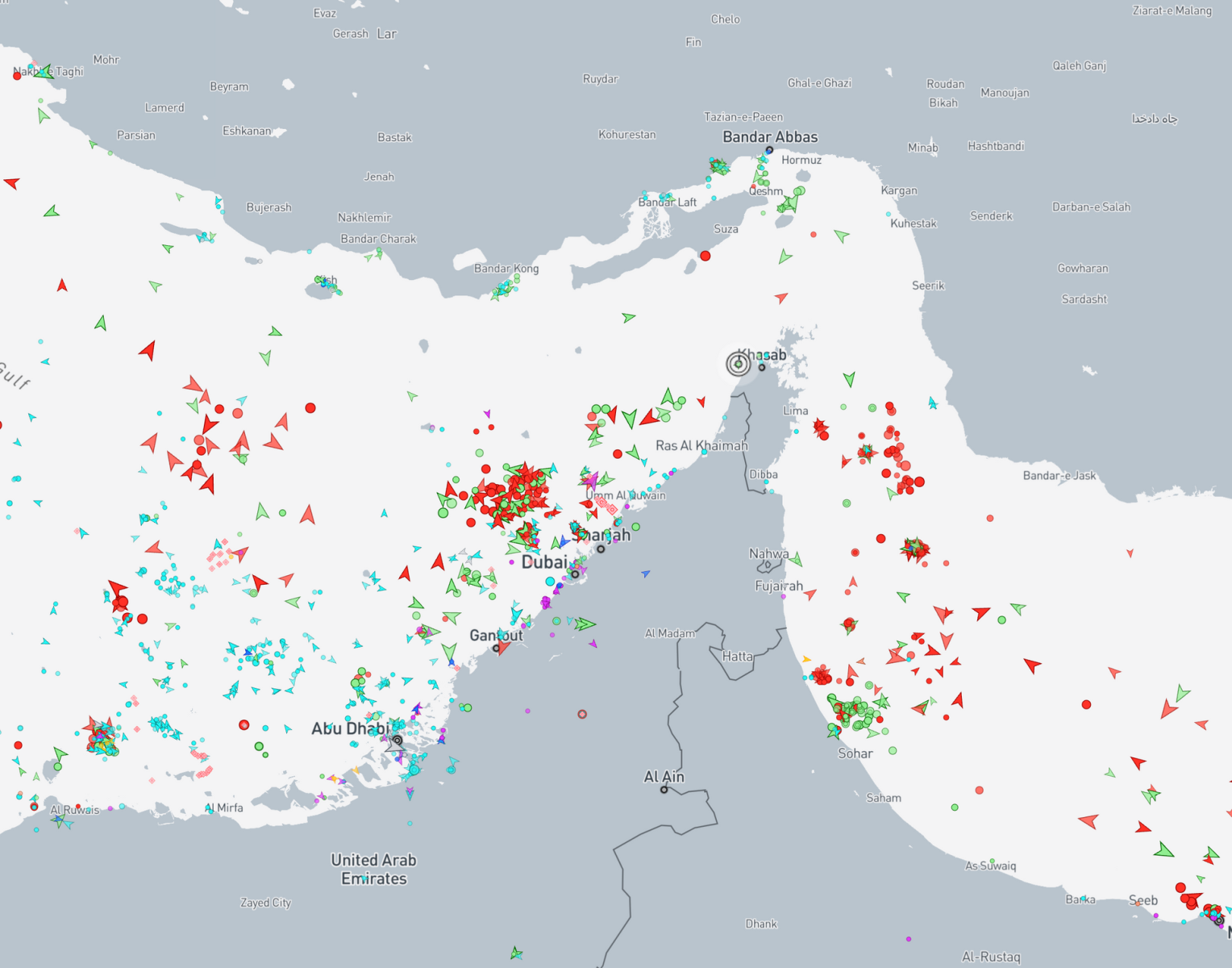 Ngày 7-3 tiếp tục chứng kiến giao thông qua eo biển Hormunz đình trệ vì chiến sự. Ảnh chụp màn hình