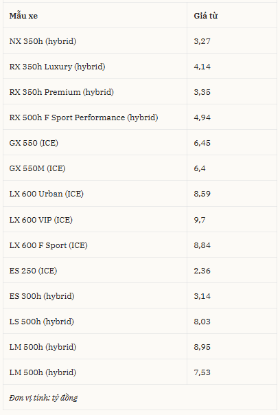 Đáng chú ý là một số mẫu xe hoặc phiên khác vẫn giữ nguyên giá bán lẻ như trước đây do không đáp ứng đủ tiêu chí về tỷ lệ sử dụng năng lượng giữa xăng và điện. Đơn cử phiên bản hiệu suất cao Lexus RX 500h F Sport Performance vẫn đang được niêm yết ở mức giá tiêu chuẩn 4,94 tỷ đồng, các phiên bản MPV cỡ lớn Lexus LM 500h tiếp tục được bán với giá từ 7,53 tỷ đồng đến 8,95 tỷ đồng.