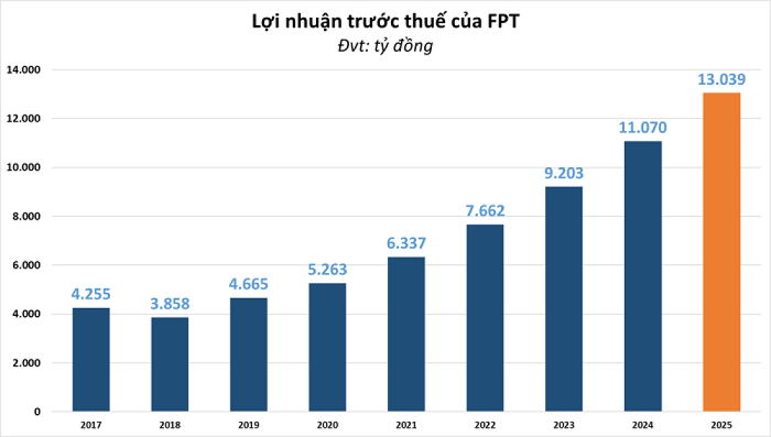 Kết thúc năm tài chính 2025, FPT ghi nhận doanh thu 70.113 tỷ đồng (tăng 11,6%) và lợi nhuận trước thuế 13.039 tỷ đồng (tăng 17,8%). Mặc dù thiết lập đỉnh lợi nhuận lịch sử hơn 13.000 tỷ đồng, doanh nghiệp vẫn không hoàn thành kế hoạch năm (đạt 93% chỉ tiêu doanh thu và 97% chỉ tiêu lợi nhuận). Đây là lần đầu tiên kể từ năm 2020 (giai đoạn COVID-19), FPT lỡ hẹn với kế hoạch lợi nhuận.