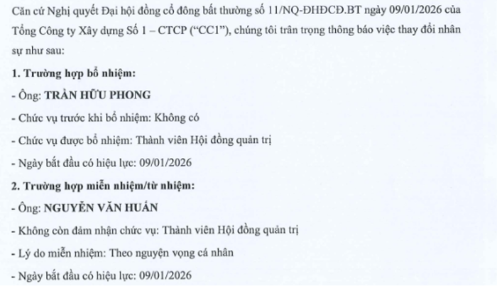 Trong khi đó, ngày 9/1/2026, Tổng công ty Xây dựng số 1 (CC1) cũng công bố thay đổi nhân sự cấp cao khi bổ nhiệm ông Trần Hữu Phong làm thành viên HĐQT và miễn nhiệm ông Nguyễn Văn Huấn theo nguyện vọng cá nhân. Ông Huấn trước đó từng giữ chức Chủ tịch HĐQT và đã từ nhiệm từ ngày 3/2/2025 để tập trung vai trò lãnh đạo tại CC1 Holdings – cổ đông lớn của CC1, song vẫn tiếp tục tham gia HĐQT.