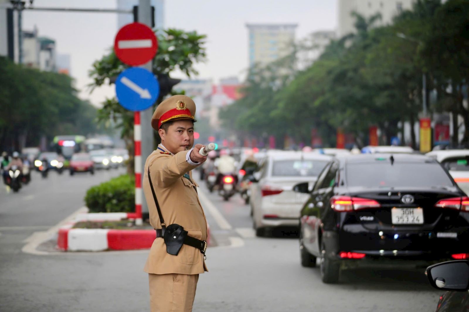 Lực lượng Cảnh sát giao thông Hà Nội có mặt làm nhiệm vụ trên các tuyến đường từ sáng sớm ngày làm việc đầu tiên sau kỳ nghỉ Tết. Ảnh: TT
