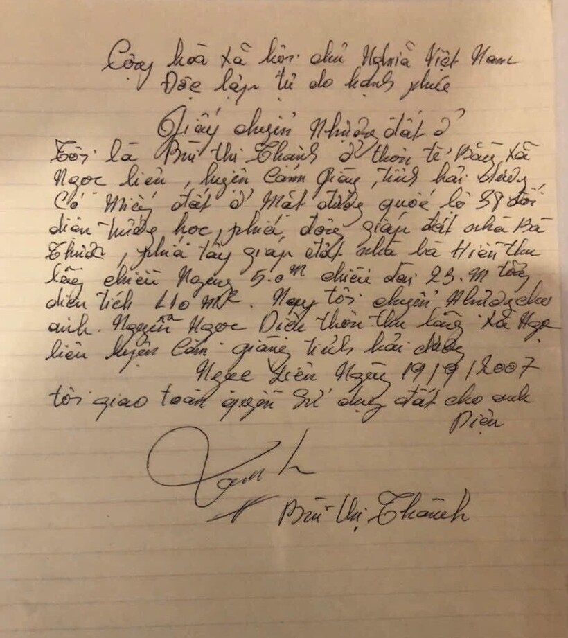 Giấy chuyển nhượng đất ở bà Thành viết và ký tên cho ông Diệu có nội dung: Tôi là Bùi Thị Thành ở thôn Tế Bằng, xã Ngọc Liên, huyện Cẩm Giàng, tỉnh Hải Dương, có miếng đất ở mặt đường quốc lộ 38 đối diện Trường tiểu học, phía Đông giáp đất nhà bà Thược, phía Tây giáp đất nhà bà Hiền Thu Lãng chiều ngang 5.0m, chiều dài 23m, tổng diện tích 110m2. Nay tôi chuyển nhượng cho anh Nguyễn Ngọc Diệu thôn Thu Lãng, xã Ngọc Liên, huyện Cẩm Giàng, tỉnh Hải Dương. Ngọc Liên ngày 19/9/2007 tôi giao toàn quyền sử dụng đất cho anh Diệu
