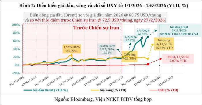 Thống kê từ Viện Nghiên cứu Kinh tế BIDV, giá dầu thô Brent có thời điểm tăng vọt lên 115,6 USD/thùng vào ngày 2/3/2026, gần gấp đôi so với đầu năm. Dù sau đó hạ nhiệt khi một số quốc gia xả kho dự trữ, giá dầu tiếp tục duy trì ở mức cao do lo ngại xung đột leo thang và nguy cơ gián đoạn vận chuyển tại eo biển Hormuz - tuyến đường trung chuyển khoảng 20% lượng dầu và khí hóa lỏng toàn cầu. Tính đến giữa tháng 3/2026, giá dầu Brent đã tăng gần 70% so với đầu năm.