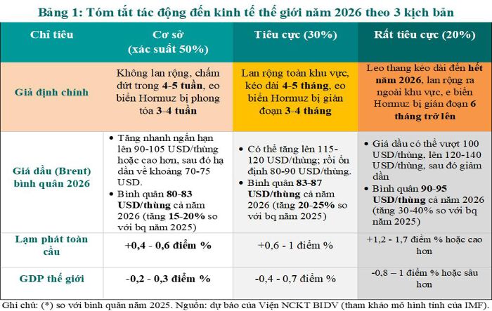 Kịch bản tiêu cực xảy ra nếu xung đột kéo dài trong khu vực và tuyến vận chuyển năng lượng tại eo biển Hormuz bị gián đoạn trong vài tháng. Khi đó, giá dầu có thể lên tăng lên mức 115-120 USD/thùng ở một số thời điểm, sau đó hạ nhiệt về mức bình quân cả năm khoảng 80 - 85 USD/thùng (tăng 15 - 20% so với bình quân cả năm 2025), khiến lạm phát toàn cầu tăng thêm 0,6 - 1 điểm phần trăm và tăng trưởng kinh tế thế giới giảm 0,4 - 0,7 điểm phần trăm.