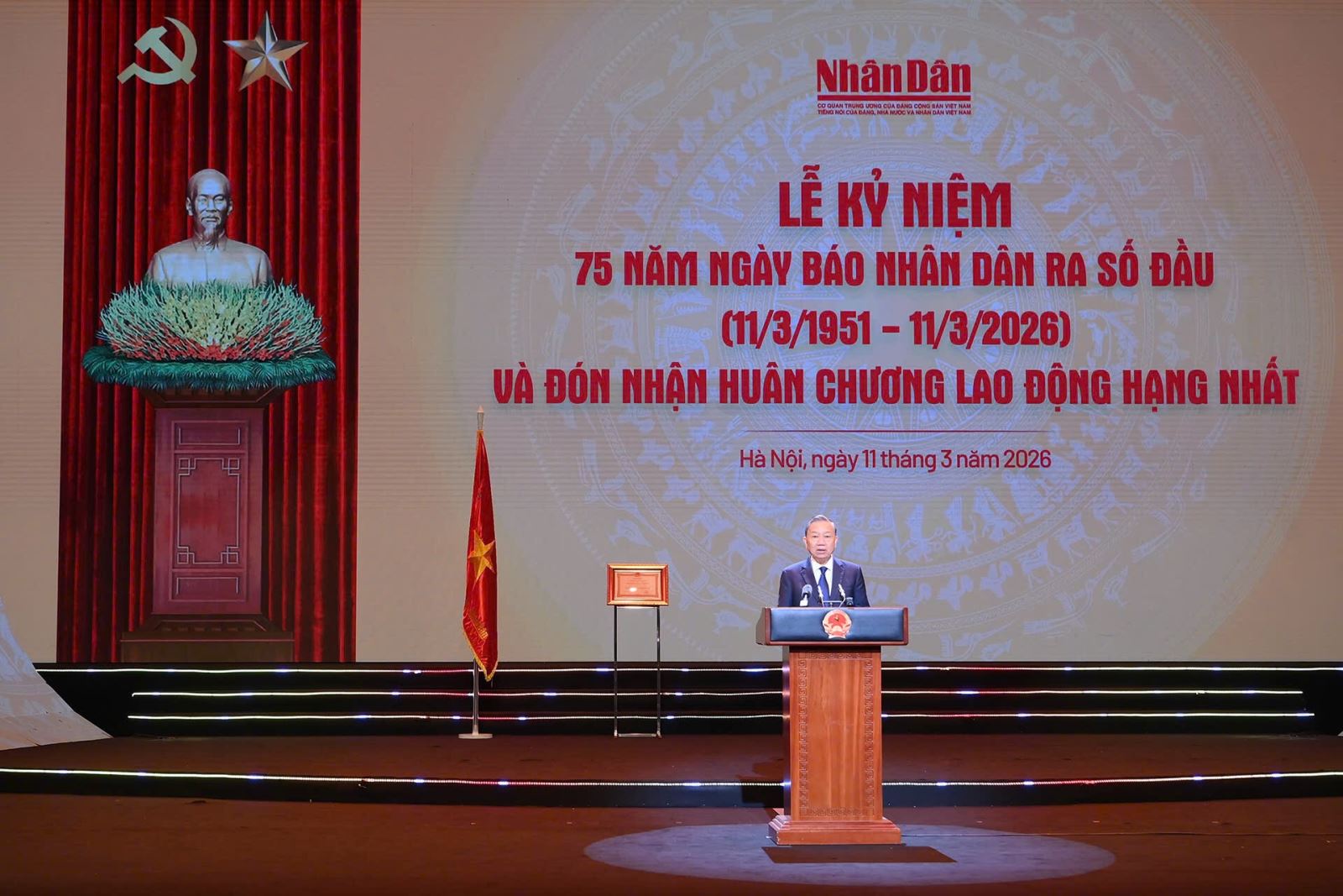 Sáng 11/3, tại Nhà hát Hồ Gươm (Hà Nội), Báo Nhân Dân long trọng tổ chức Lễ kỷ niệm 75 năm Ngày Báo Nhân Dân ra số đầu (11/3/1951-11/3/2026) và đón nhận Huân chương Lao động hạng Nhất do Đảng và Nhà nước trao tặng.