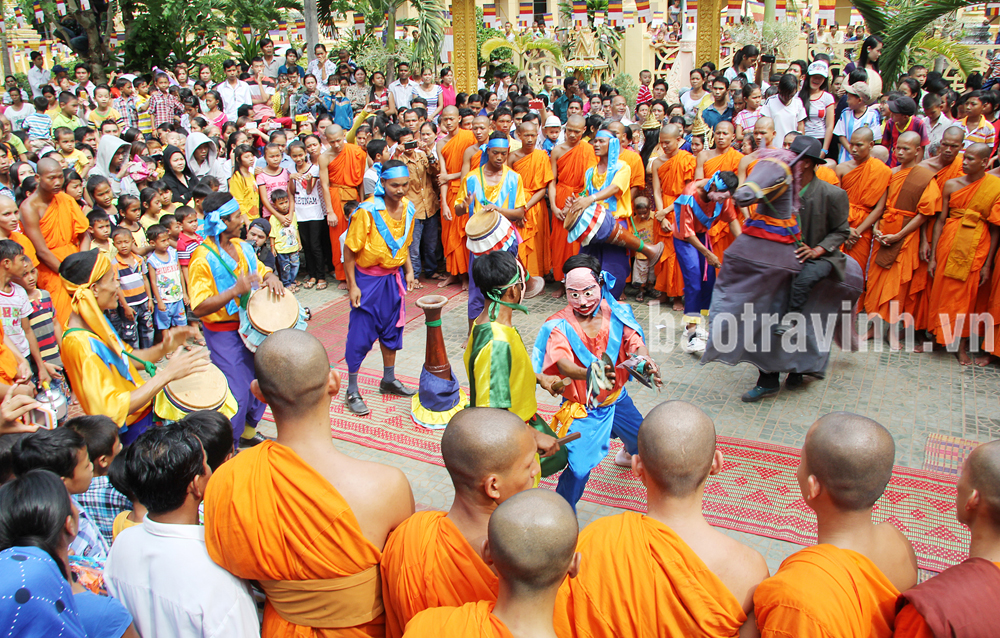Múa trống sa-dăm trong Tết cổ truyền Chôl Chnăm Thmây tại chùa Âng, Phường 8, thành phố Trà Vinh. Ảnh: BÁ THI