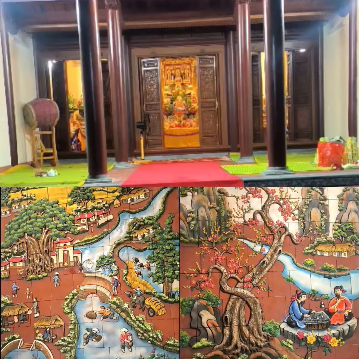 Từng đường nét kiến trúc, từ mái ngói, những bức tường gạch mộc đến hoa văn điêu khắc mềm mại, đều toát lên vẻ công phu và lòng thành kính của con cháu với tổ tiên. Bên trong khuôn viên, các bức tranh gốm dân gian được bố trí hài hòa, tái hiện sinh động khung cảnh quê Bắc Bộ – cây đa, bến nước, dòng sông, người thợ chăm chỉ bên khung vải. Tất cả tạo nên không gian vừa cổ kính, vừa đậm chất nghệ thuật, góp phần tôn lên sự trang nghiêm và hồn quê của công trình văn hoá tâm linh.