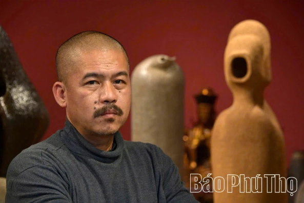 3 - Bên cạnh những “nốt nhạc” chủ âm ấy là lớp nghệ sĩ gắn bó với xứ Mường bằng nhiều cơ duyên khác nhau. Như nhà điêu khắc Bùi Văn Đạo kể câu chuyện quê hương bằng gốm và gỗ. Có chung điểm xuất phát từ lễ khai hạ, mừng cơm mới, từ hình ảnh các mẹ, các chị quây quần bên bếp lửa. Trong tác phẩm của anh, cái ớp Mường - vật dụng được sử dụng thường ngày của người phụ nữ Mường đã trở thành biểu tượng của ký ức không phai nhạt. Với anh, nghệ thuật là cách giữ lại những phong tục đã và đang biến mất.